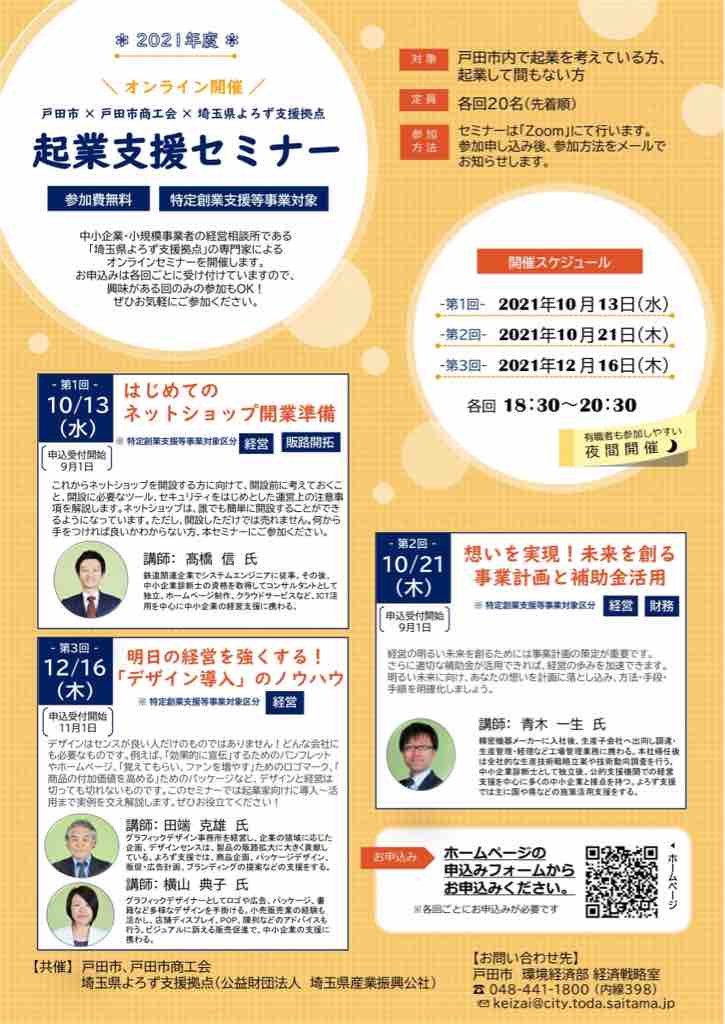 ■ 戸田市の起業支援セミナー(zoomによるオンラインセミナー)が10月13日より開講。戸田市で起業を考えている方・起業して間もない方が対象。第1・2回の申込は始まっています。