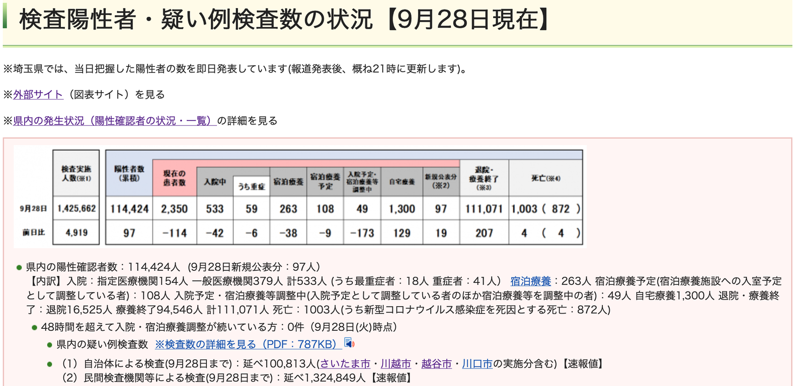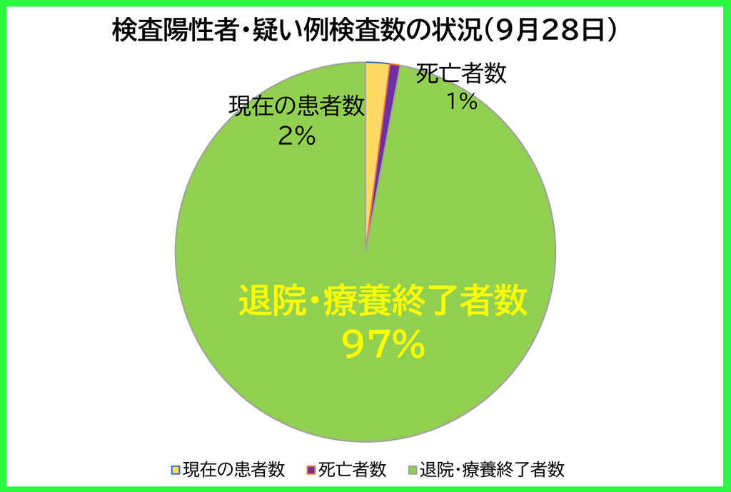 9月28日(火)、埼玉県の現在の患者数は、前日より「114人【減少】」の計2350人。207人の方が、退院・療養終了されました(新たな陽性者は97人)。