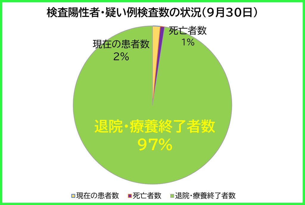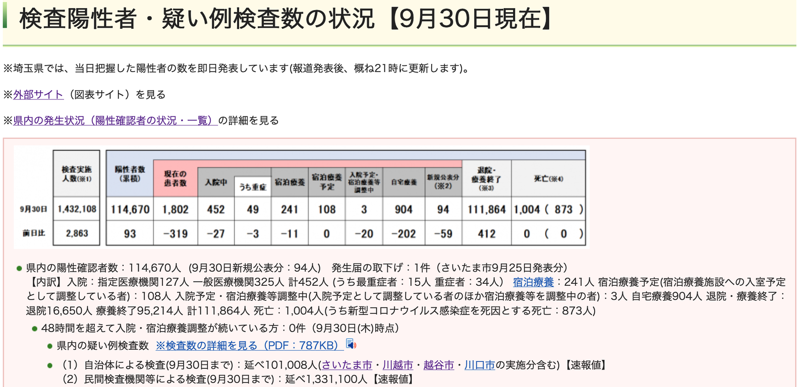 9月30日(木)、埼玉県の現在の患者数は、前日より「319人【減少】」の計1802人。412人の方が、退院・療養終了されました(新たな陽性者は93人)。