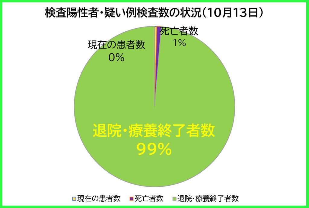 10月13日(水)、埼玉県の現在の患者数は、前日より「9人【減少】」の計525人。59人の方が、退院・療養終了されました(新たな陽性者は51人)。