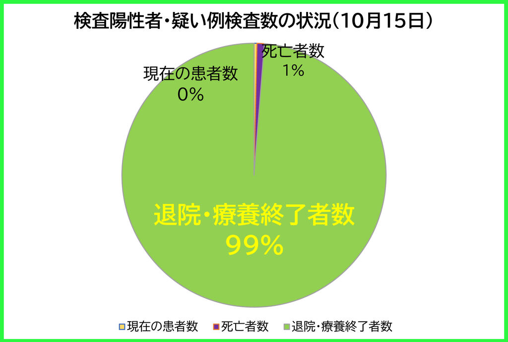 10月15日(金)、埼玉県の現在の患者数は、前日より「48人【減少】」の計422人。74人の方が、退院・療養終了されました(新たな陽性者は26人)。