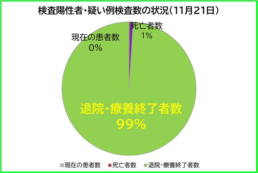 11月21日(日)、埼玉県の現在の患者数は、前日比較【増減なし】の計98人。7人が退院・療養終了されました(新たな陽性者は7人)。