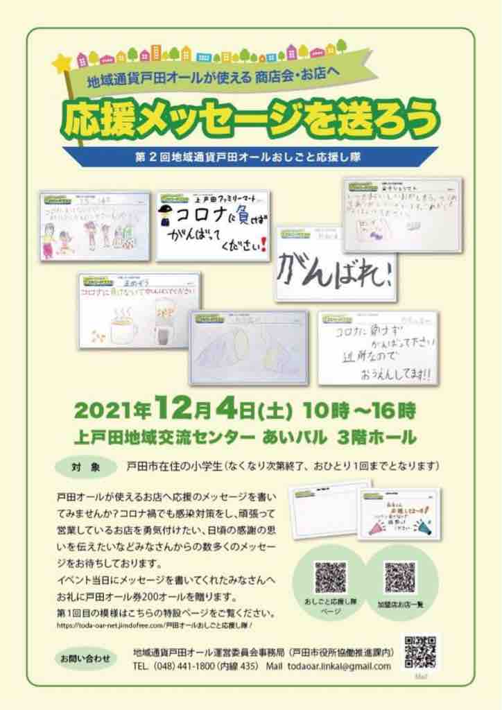 ■ 戸田市在住小学生対象「地域通貨戸田オールが使える商店会・お店へ応援メッセージを送ろう」企画、12月4日(土曜日)にあいパルで開催。投稿者にはオールでの謝礼もあります。