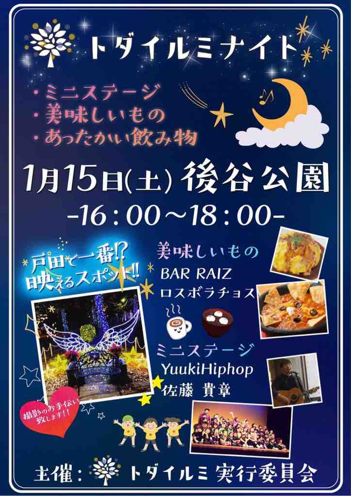 ■ トダイルミナイト、1月15日(土曜日)開催!後谷公園で16時から18時まで。照明付き写真撮影サービス、ミニステージ、温かい飲み物や食べ物のブースもあります。