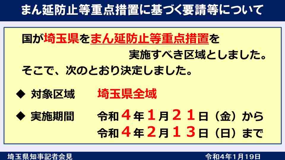 昨日、埼玉県に再び「まん延防止等重点措置」が実施されることが正式に決まりました。期間は明日21日(金)から2月13日(日)までとなります。