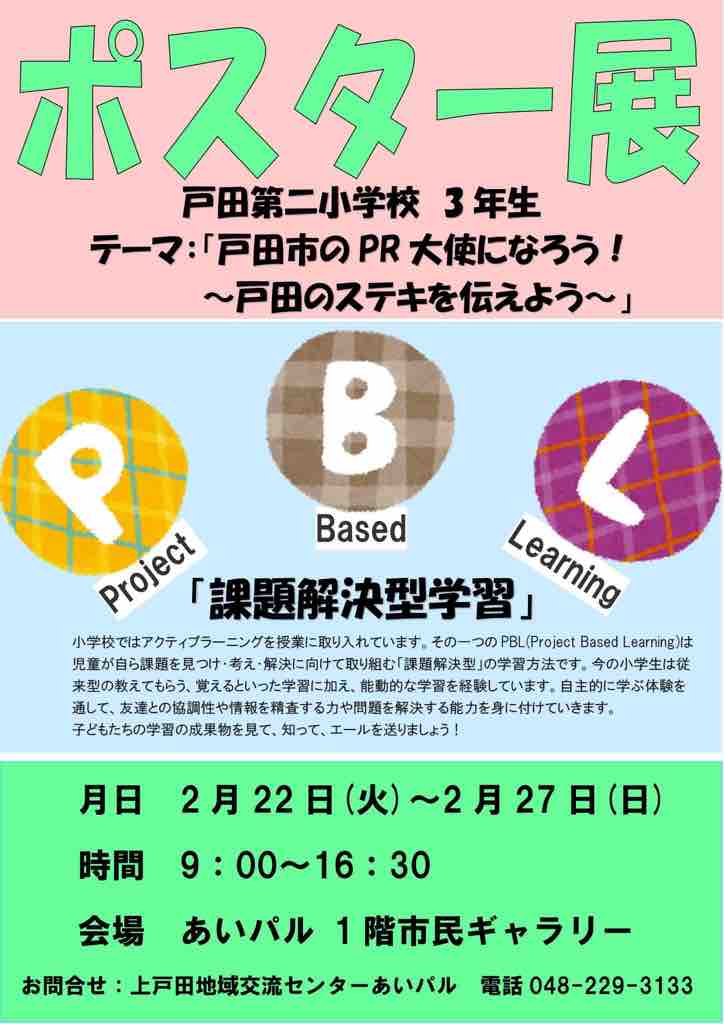 ■ 「戸田第二小学校3年生ポスター展(テーマ)戸田市のPR大使になろう!〜戸田のステキを伝えよう〜」上戸田地域交流センターあいパルで、本日(22日)から27日まで開催です。