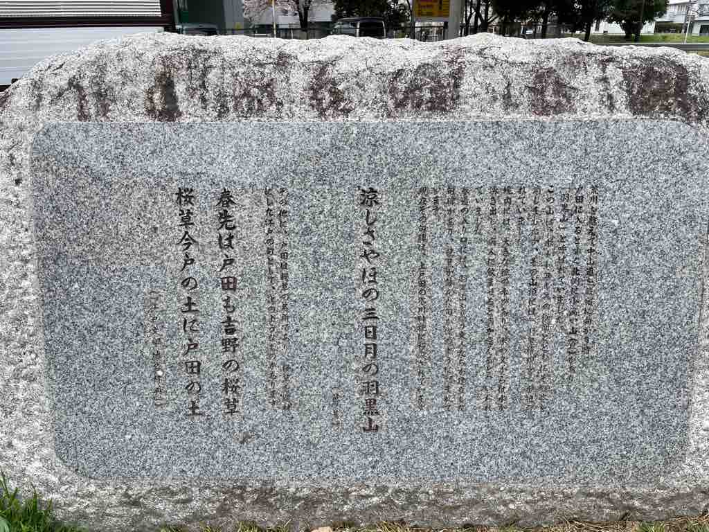 オリンピック通り側の出入口付近にある石碑。かつてこの近く、現在の戸田ボートコース付近にあった「羽黒山」のことが書かれています。