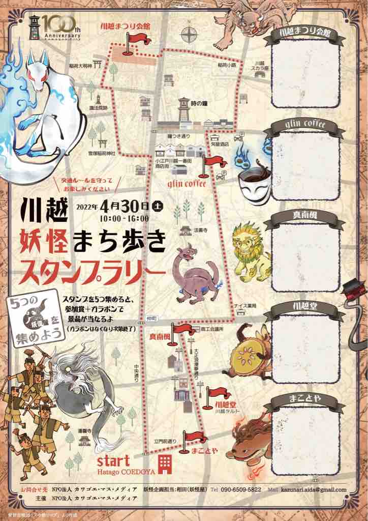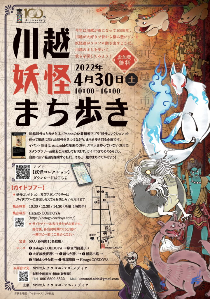 ■ (番外編)4月30日(土)川越市で市制100周年記念イベント「妖怪まち歩き」開催。妖怪を探し封印しながら、街歩きを楽しむ企画です。近代建築ガイドツアー等も同時開催!