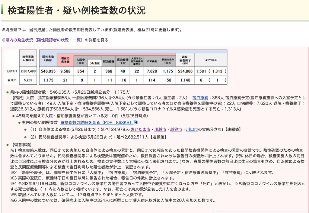 5月26日(木)、埼玉県の現在の患者数は、前日比【21人増加】の計9588人。退院・療養終了者は1148人(新たな陽性者1175人)。