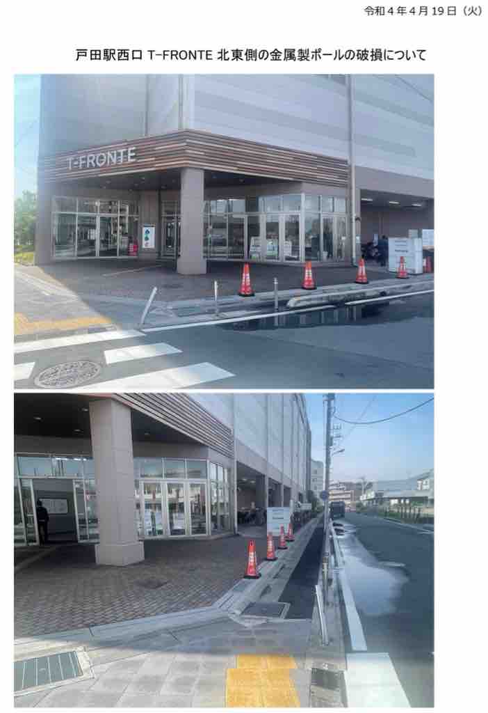 ■ 戸田駅西口側のT-FRONTE(ティーフロンテ)前の金属ポールの修復が完了しました。市民の方から「曲がっている」と情報提供いただいた場所です。ありがとうございました。