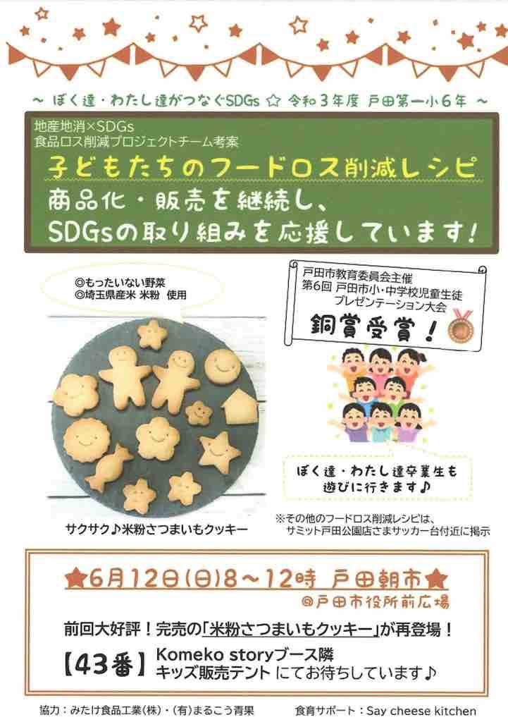 ■ 本日開催の戸田朝市に、今回も戸田第一小学校児童たちのブースがでます。前回あっという間に完売した「米粉さつまいもクッキー」が再登場!フードロス削減の取り組みです。