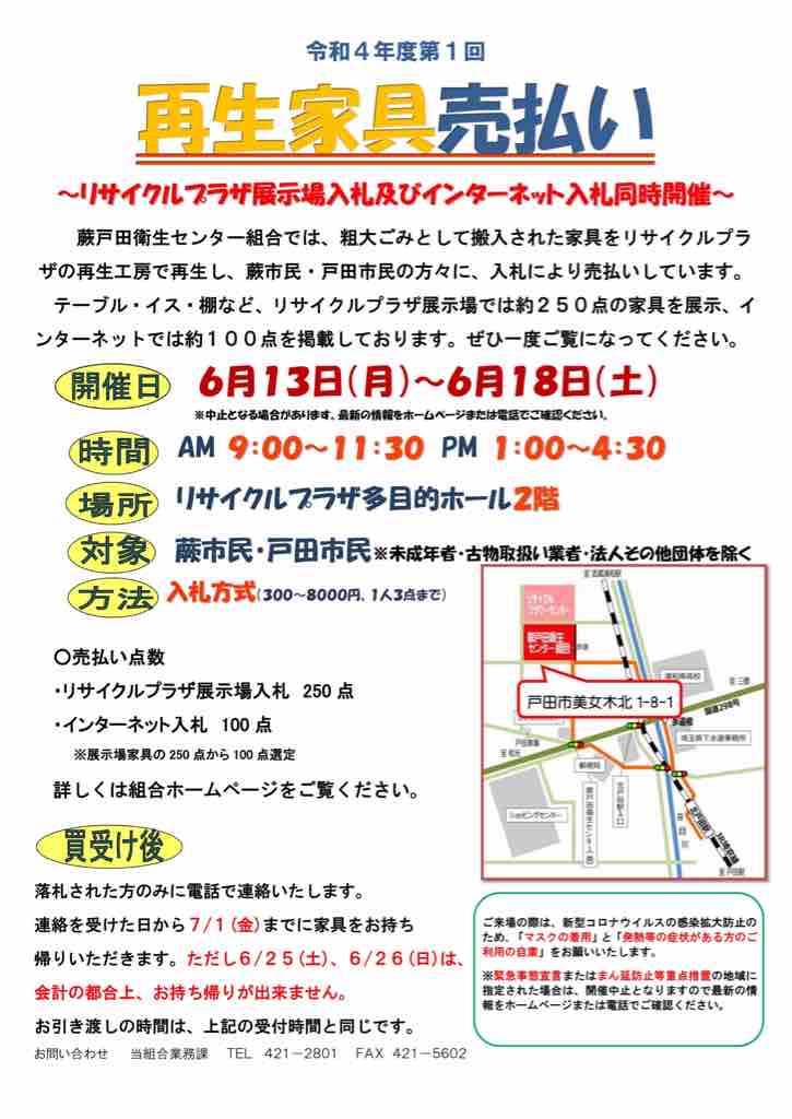 ■ 再生家具の売り払いが蕨戸田衛生センターで昨日(13日)より始まりました。会場販売とインターネット販売の2つがあります。戸田市民・蕨市民、周辺地区の方が販売対象です。
