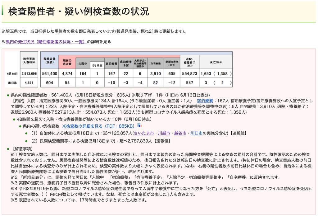 6月18日(土)、埼玉県の現在の患者数は、前日比【54人増加】の計4874人。退院・療養終了者は547人(新たな陽性者604人)。