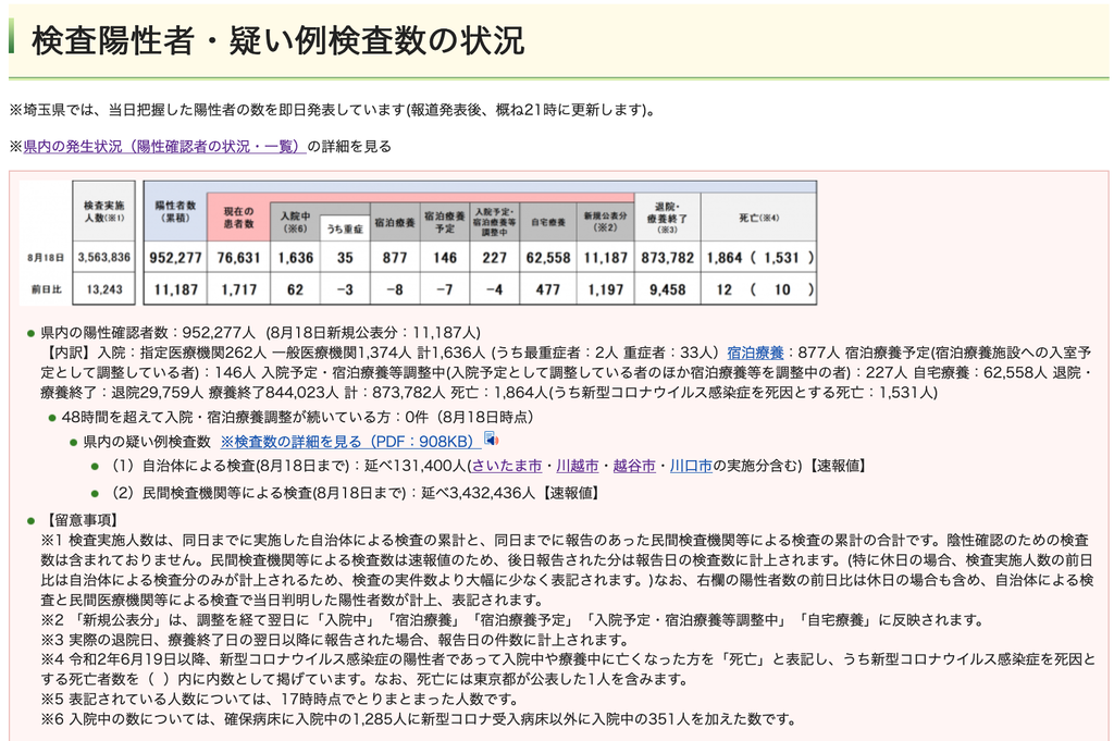 8月18日(木)、埼玉県の現在の患者数は、前日比【1717人増加】の計76631人。退院・療養終了は9458人(新たな陽性者11187人)。