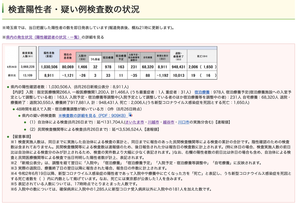 8月26日(金)、埼玉県の現在の患者数は、前日比1121人【減少】の計80069人。退院・療養終了は10013人(新たな陽性者8911人)。