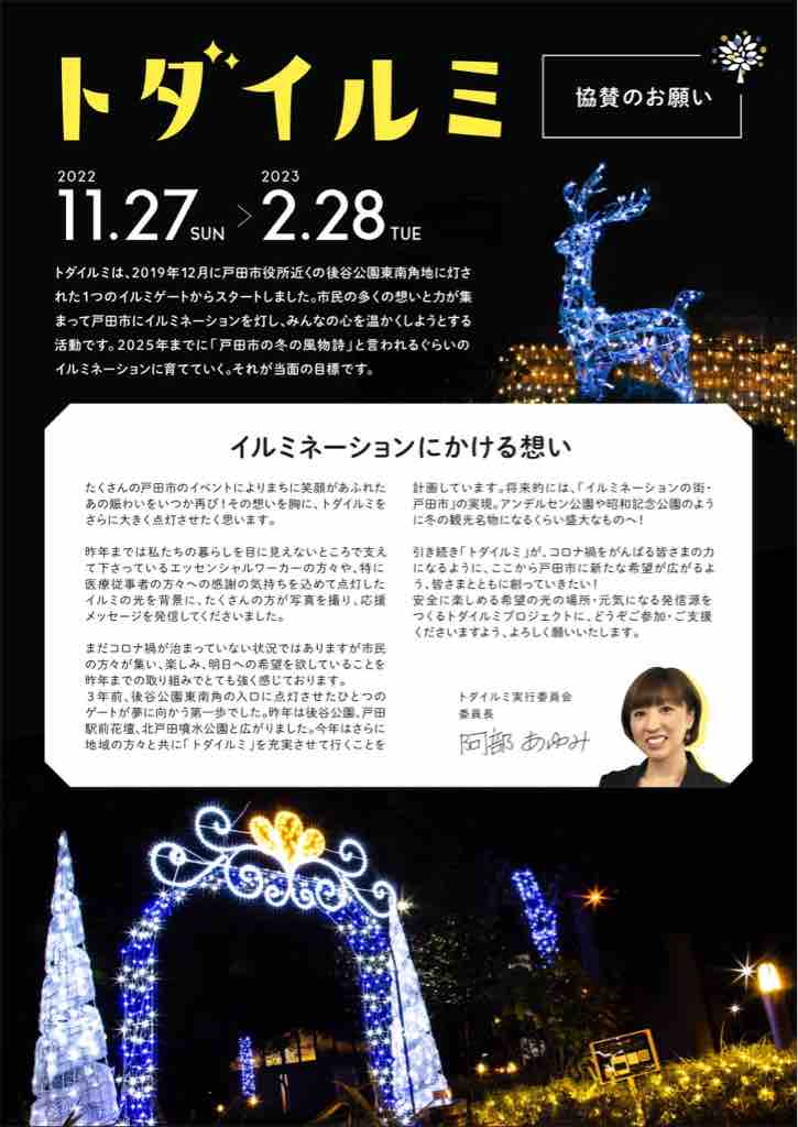 ■ トダイルミ2022、今年も後谷公園・戸田駅東口前花壇・噴水公園(北戸田駅西口近く)に点灯します。後谷公園会場では11月27日から2月28日まで点灯。協賛のお願いが始まっています。