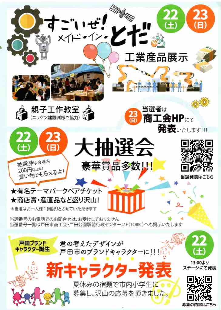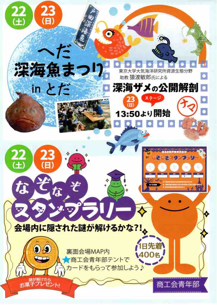 ■ 今年は3年ぶりに「戸田市商工祭」開催!10月22・23日(土日)。あの「へだ深海魚まつりinとだ」も帰ってきます!メイン会場は戸田市役所内。どうぞ楽しみにお待ちください。