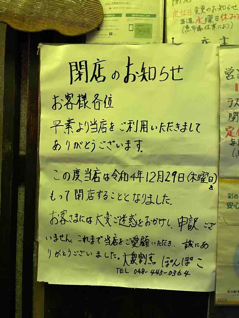 ■川岸2丁目大衆割烹「ぽんぽこ」さんが12月29日(木)をもって閉店されます。大きな唐揚げやカキフライに驚き、名物「肉豆腐」に舌鼓を打つ素敵なお店でした。ありがとうございました。