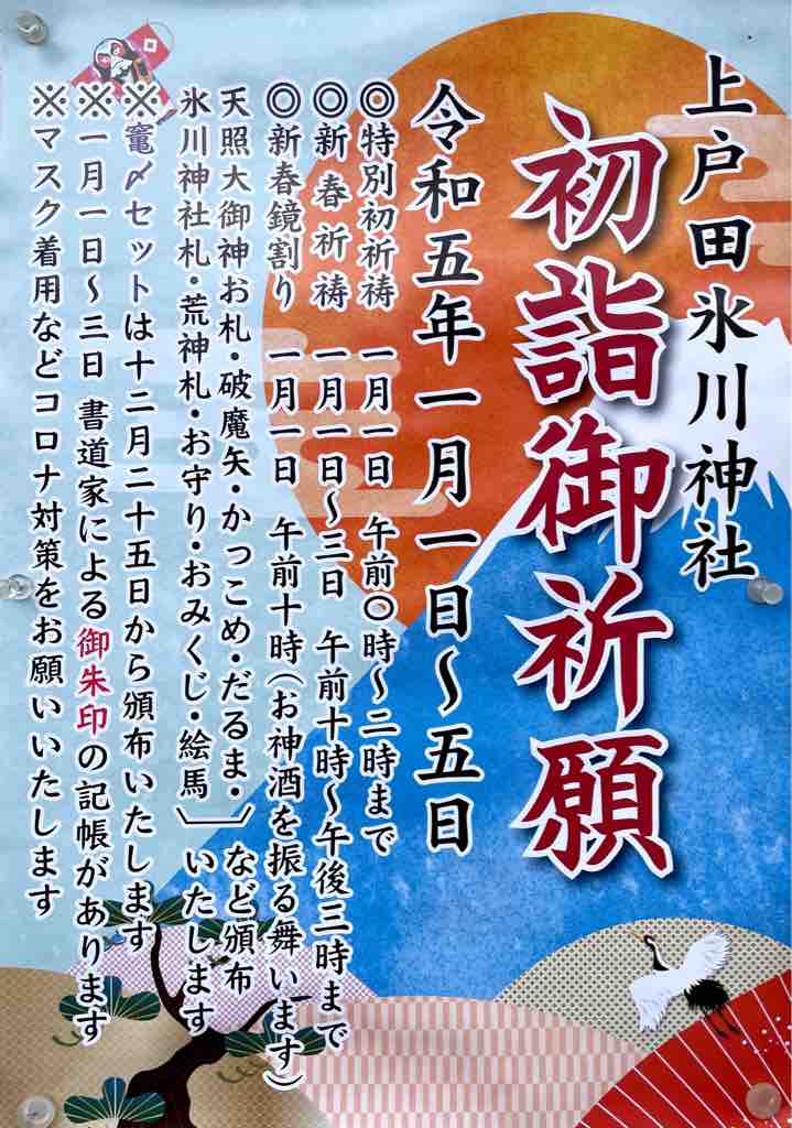 ■上戸田氷川神社初詣御祈願は令和5年1月1日から5日まで。特別初祈祷は元旦午前0時から2時まで行われます。元旦午前10時には鏡割り・お神酒振る舞いもあります。ぜひお越しください。