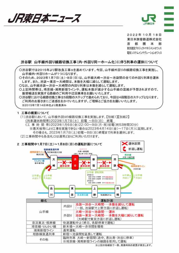 ■今日明日(7・8日)は山手線渋谷駅改良工事のため、山手線外回り大崎から池袋までの区間が終日運休となります。埼京線は「新木場〜大崎〜赤羽」間の便が増発されます。