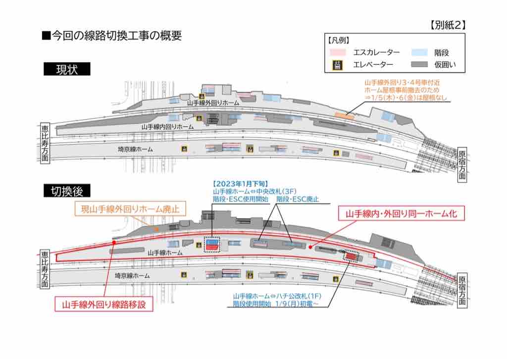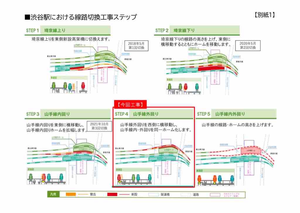 これまで1ステップ目と2ステップ目では埼京線渋谷駅上下線ホームの移動が行われました。今回の5ステップ目では、現在外回りと内回りで分かれている山手線の2ホームを一つにまとめる工事です。