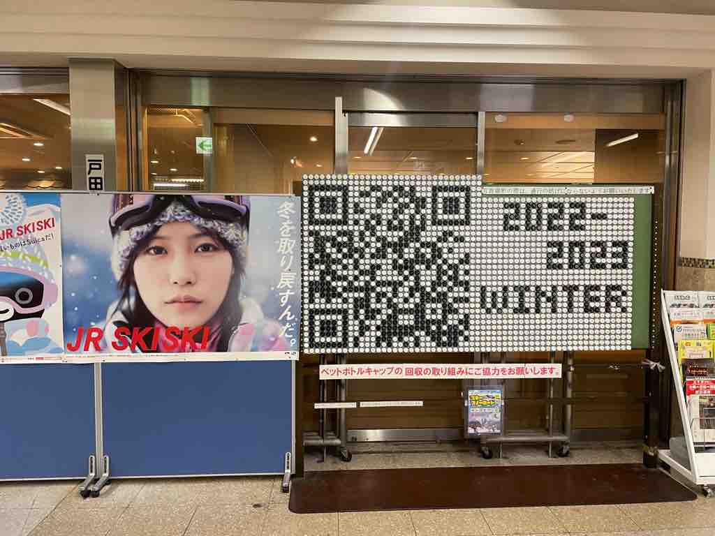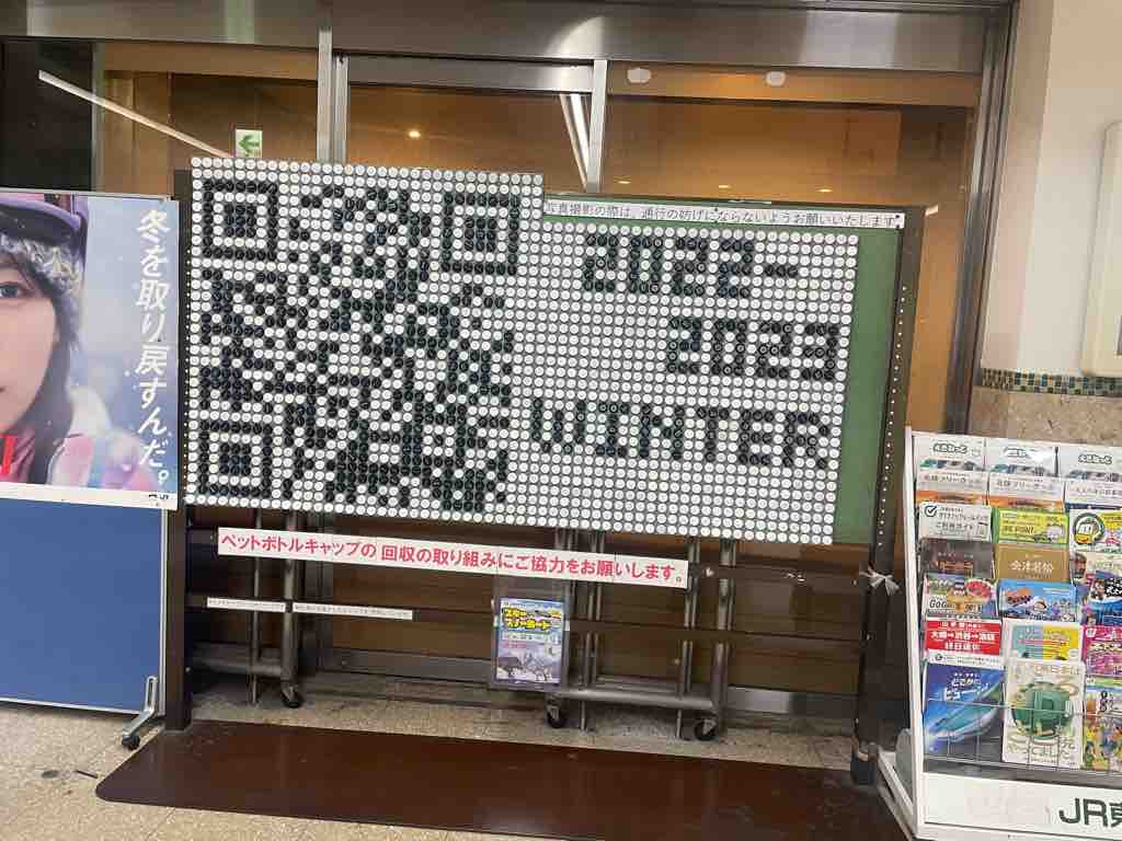 いつもは色の指定に合わせてペットボトルのキャップをはめていくと電車の絵などができあがるのですが、昨年12月あたりから開示されているのは巨大なQRコードのエコキャップアート。