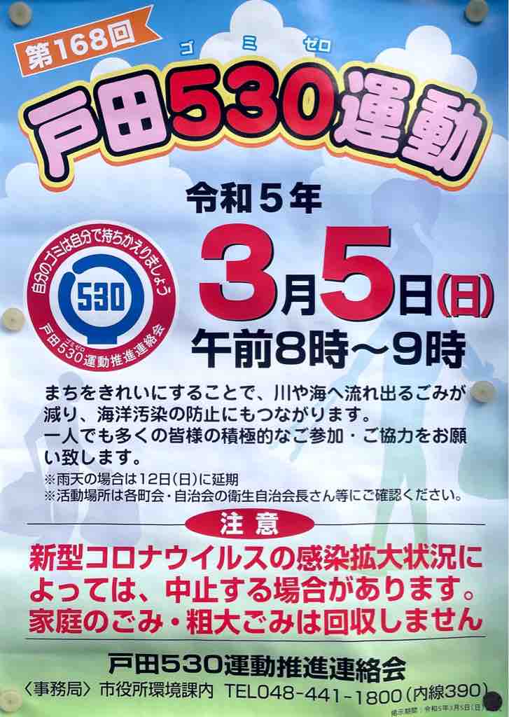 ■ 明日3月5日(日)は戸田市「530運動(ゴミゼロ)」活動日。午前8時から9時まで、町会・自治会のゴミ集積所で用具を受け取り清掃活動をお願いします。参加者には御礼があります。
