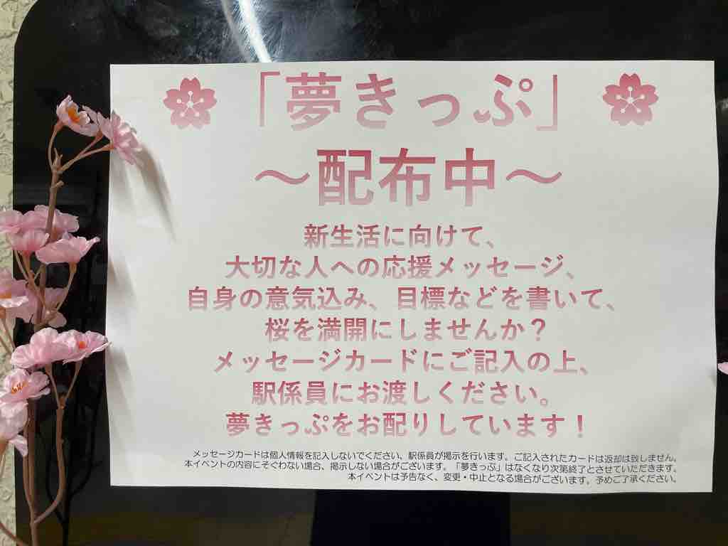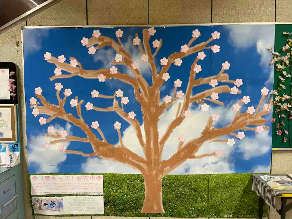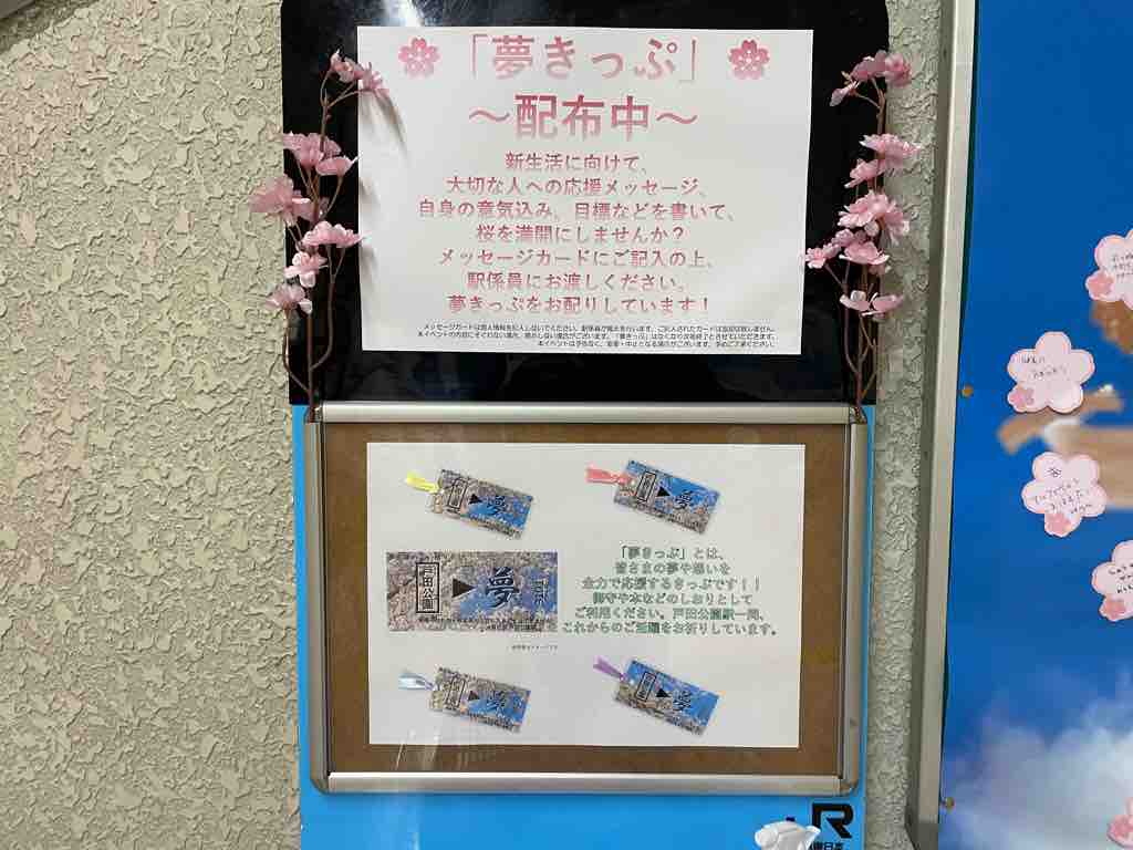 ■戸田公園駅で、大切な人への応援メッセージや自分の目標などを書いて「夢きっぷ」を手に入れよう!さらに参加者の想いが戸田公園駅に桜を咲かせます。皆様の力で満開にしてください。