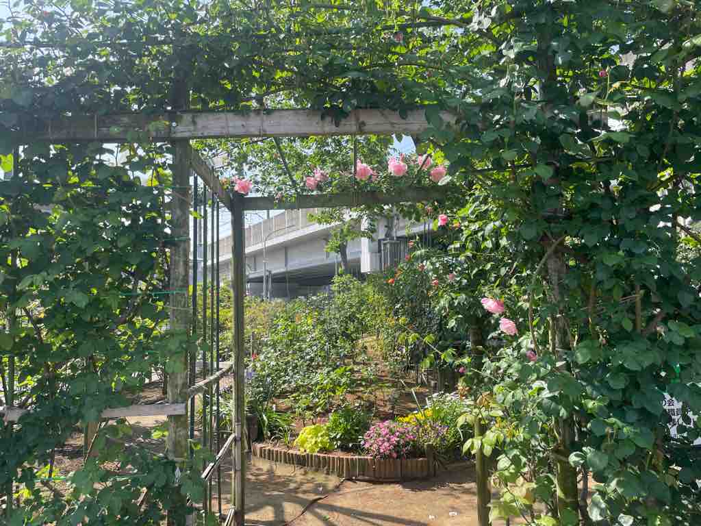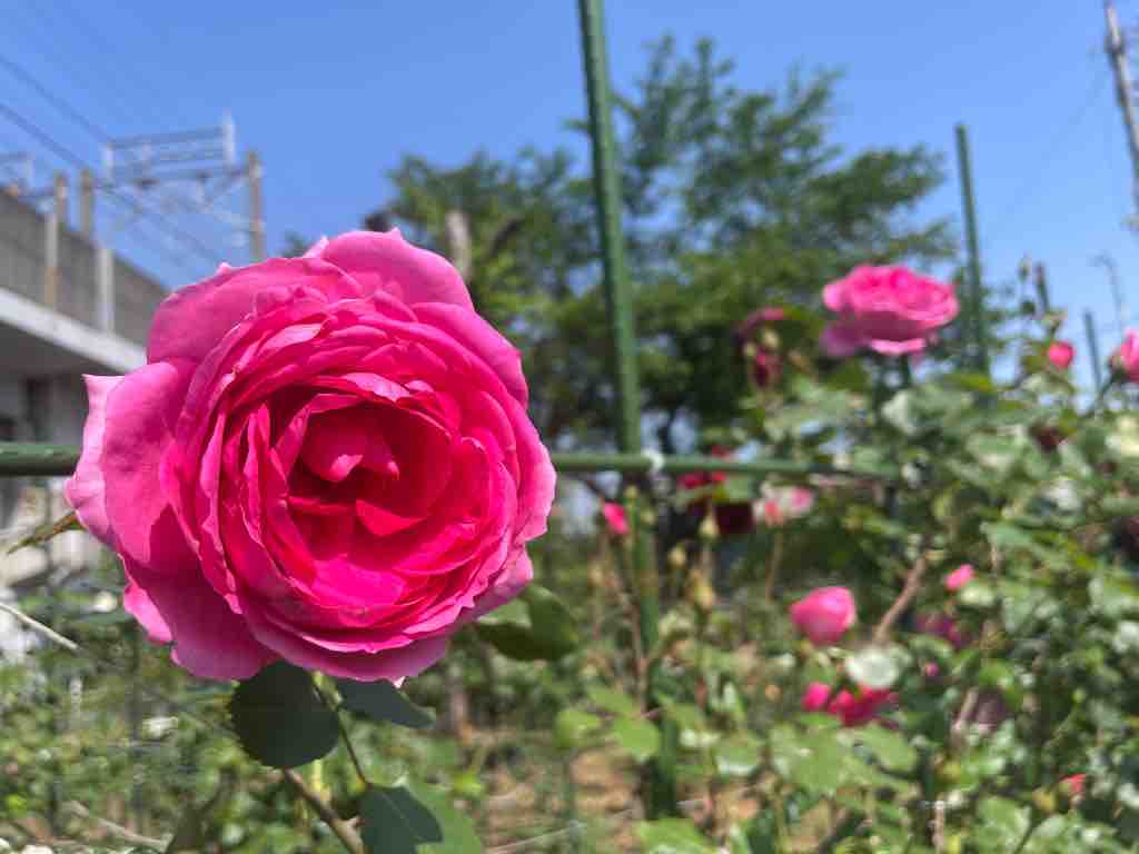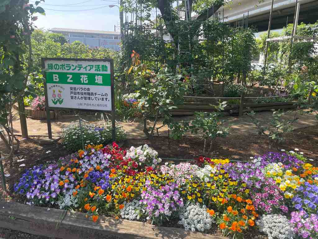 ■BZ花壇で薔薇が咲き始めました!戸田駅から埼京線高架に沿って南に徒歩2分。香りの良い薔薇種を集めた花壇。ボランティアで薔薇の移植育生を長年続けてくださる松井さんに感謝します。