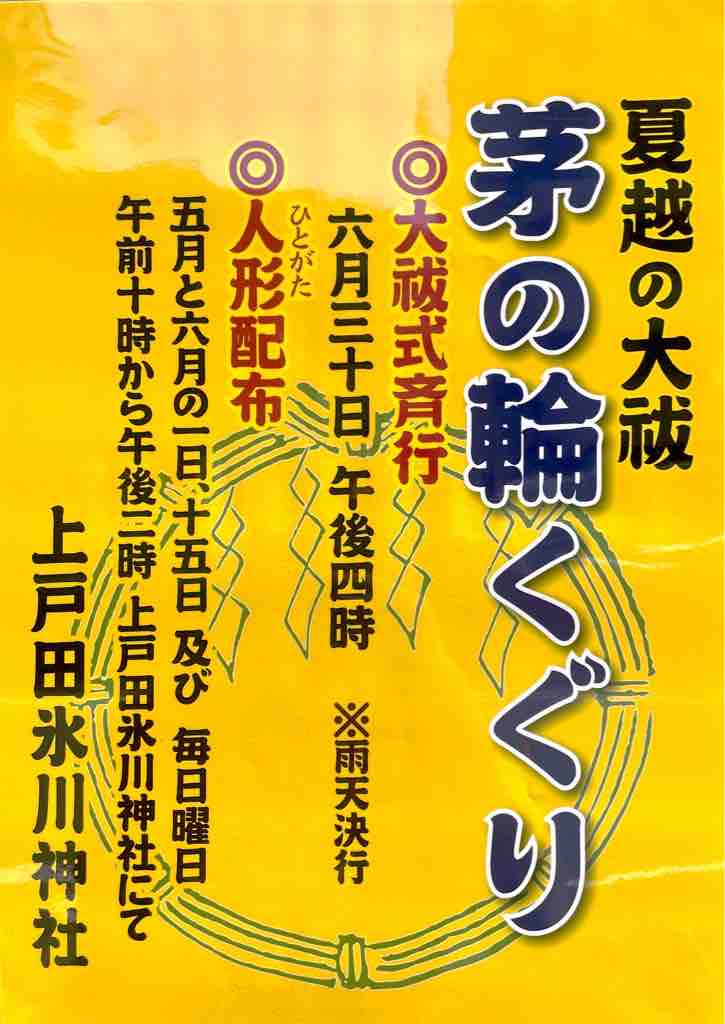 ■ 上戸田氷川神社で「夏越の大祓(なごしのおおはらえ)」令和5年6月30日(金)開催。茅の輪くぐりを体験できる大祓式は午後4時から。神事に使う人形(ひとがた)頒布も始まっています。