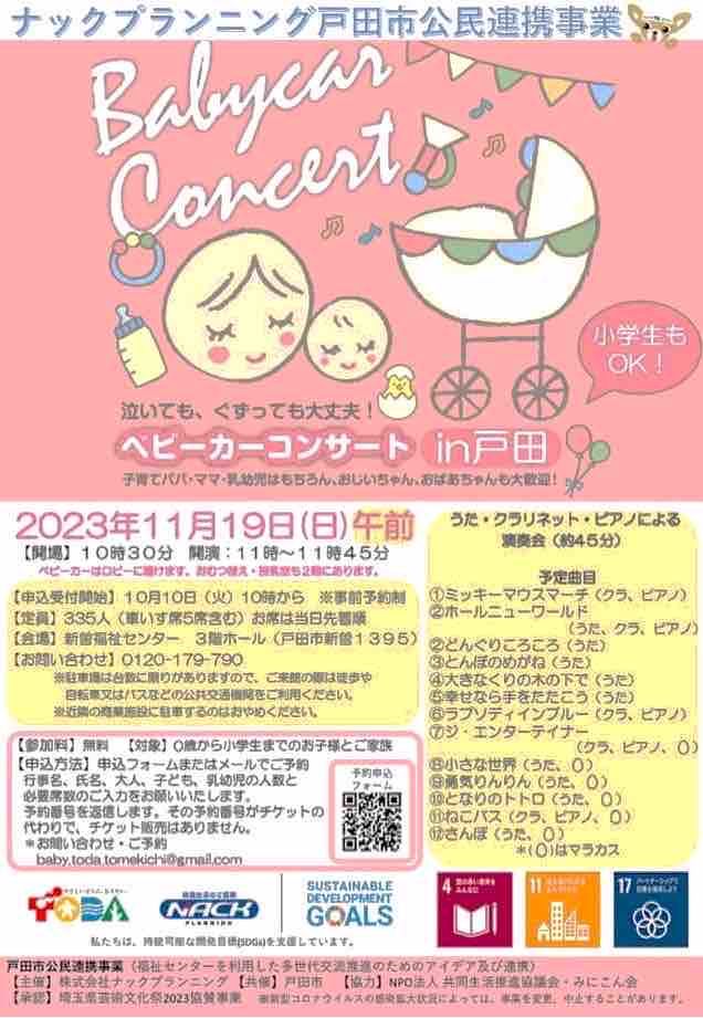 2023年10月10日 【本日10時より申込開始】ベビーカーコンサートin戸田市(11月19日開催)の予約申込が本日10時より始まります。毎回あっという間に定員に達する企画です。参加無料。 毎回、申し込みからあっという間に定員に達するほど人気のベビーカーコンサートの申し込みが本日10時から始まります!株式会社ナックプランニング主催。戸田市公民連携事業。◆申し込みフォームhttps://docs.google.com/forms/u/0/d/1uHmS7NCLRXFxWPpkcMQDqmzx2yM2emhmblUqVNYu9YA/closedform 「イベント」カテゴリの最新記事 < 前の記事次の記事 > コメント コメントフォーム 名前 コメント 評価する リセット リセット 顔 星 投稿する 情報を記憶