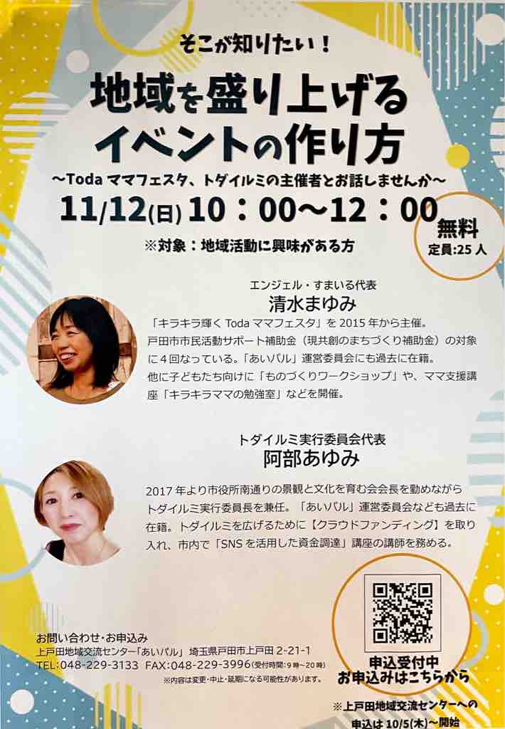 ◾︎【明後日開催】戸田市の市民活動を牽引する二大巨匠が登壇「そこが知りたい!地域を盛り上げるイベントの作り方」講座11月12日(日)開催。参加費無料。市民活動をリードする2人に注目です!