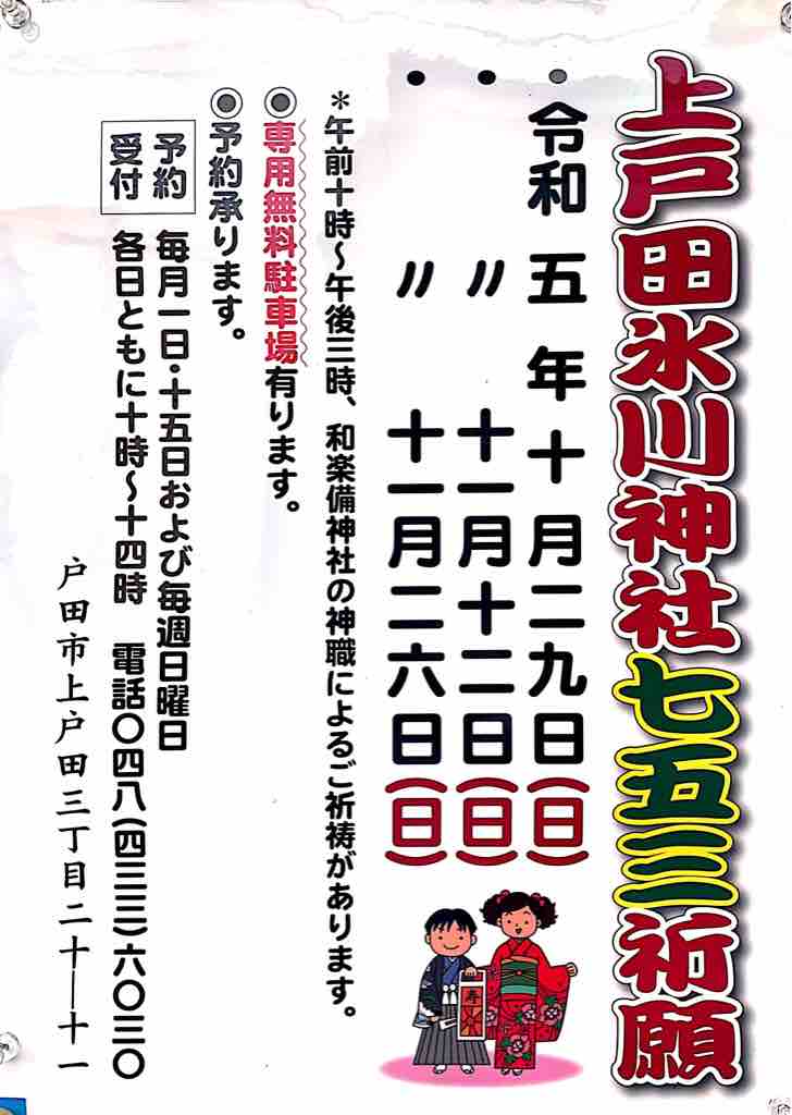 ◼︎【明日開催】上戸田氷川神社七五三祈願、11月12日(日)・26日(日)開催。午前10時から午後3時までの時間帯、和楽備神社の神職さまによる御祈祷が受けられます。