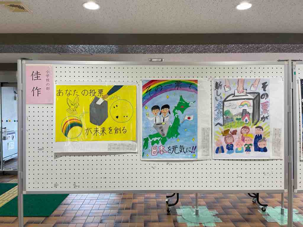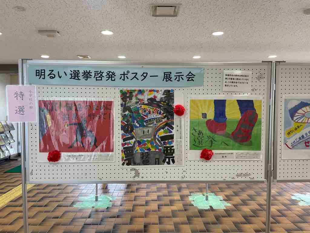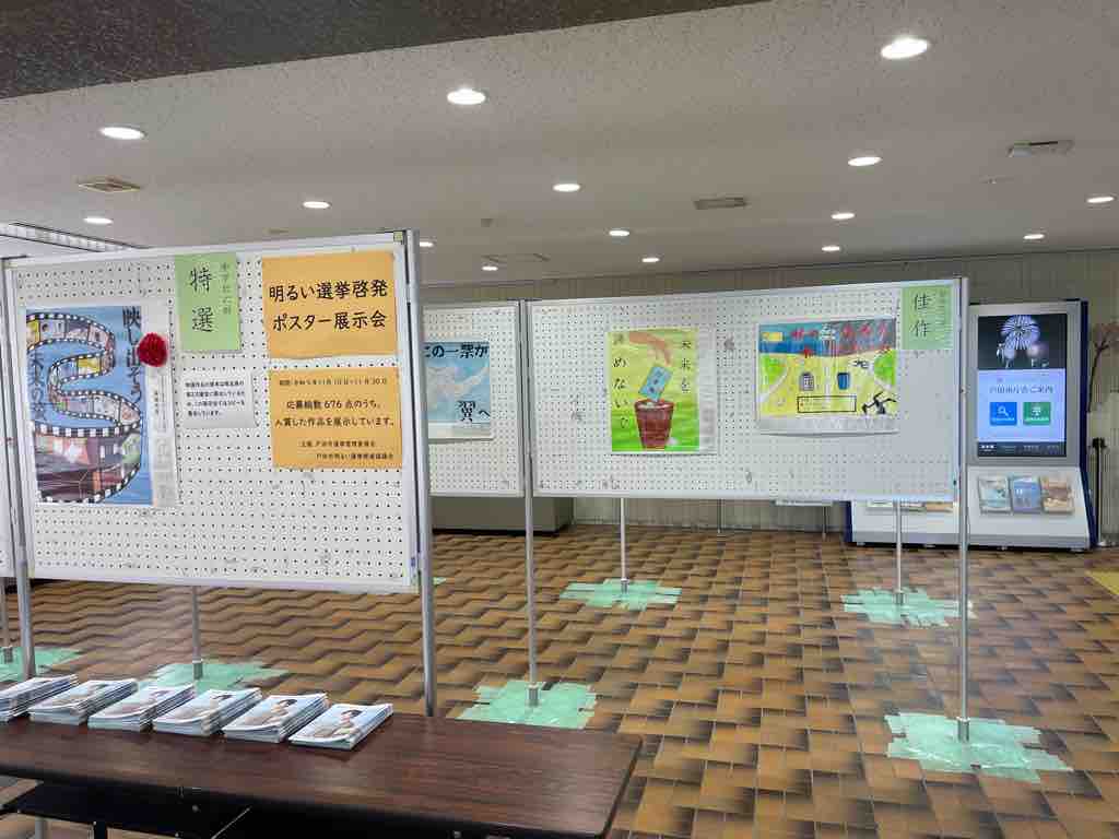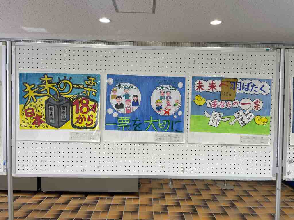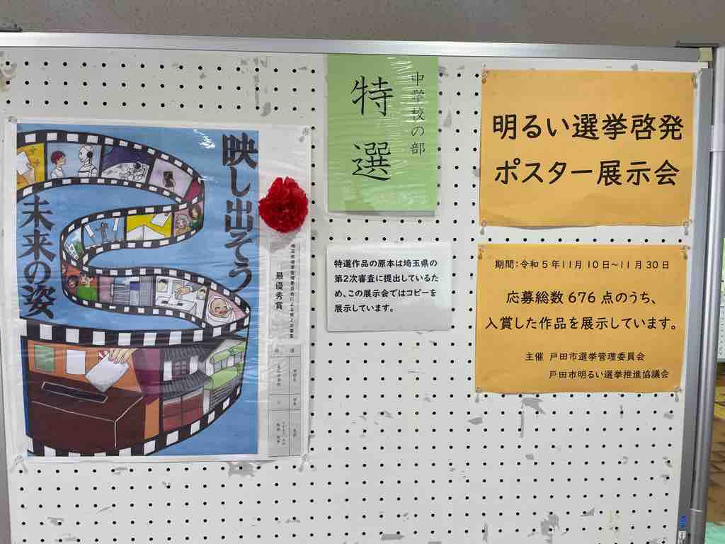 今、その場所を使って「明るい選挙啓発ポスター展示会」が開催されています。戸田市内の小中学生の作品が展示されておりますが、一つひとつ、つい見入ってしまうくらいの力作です。