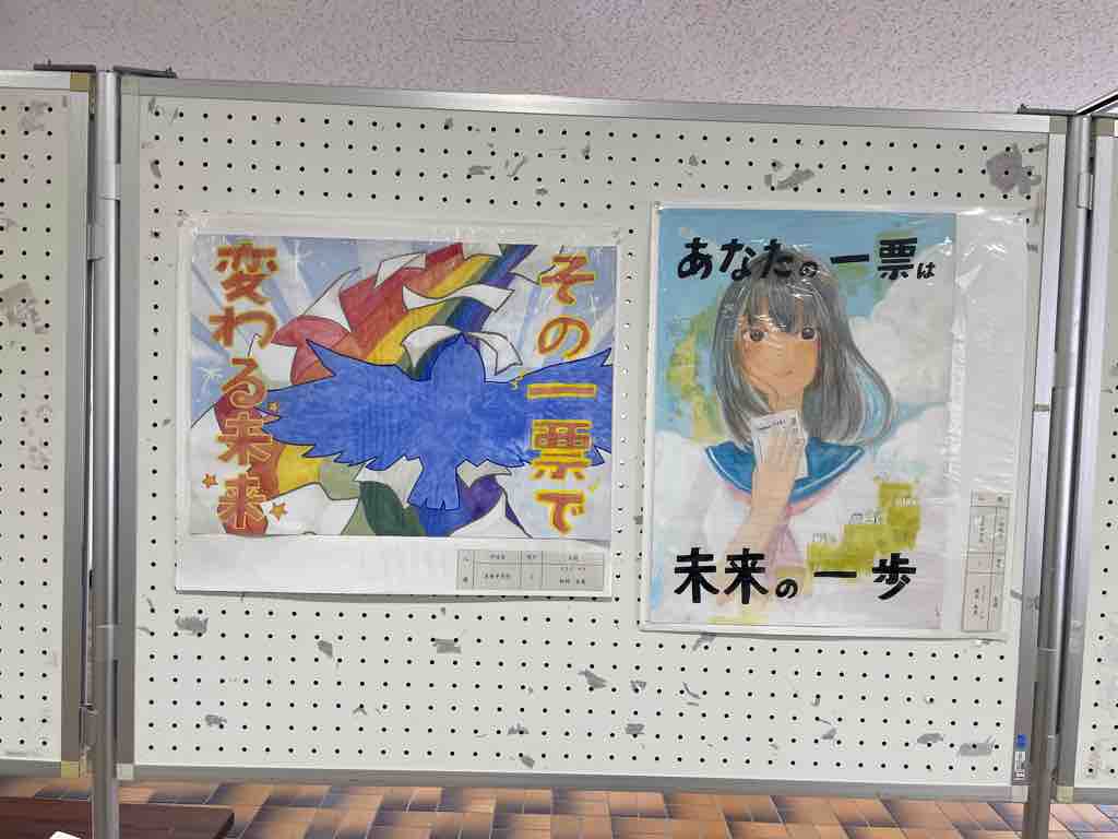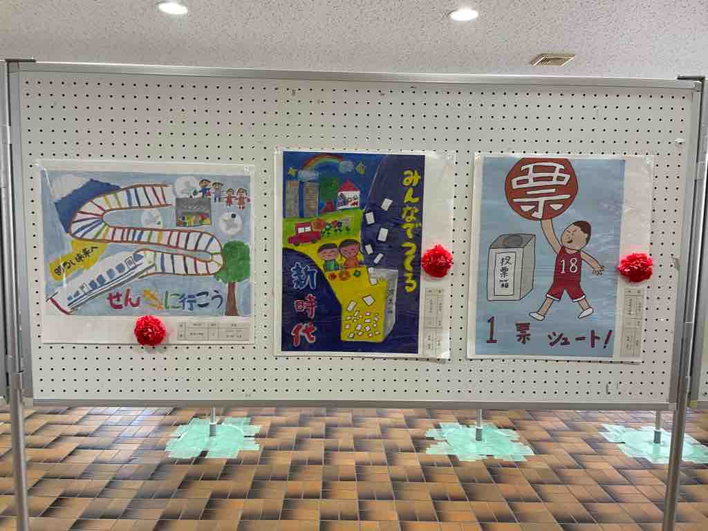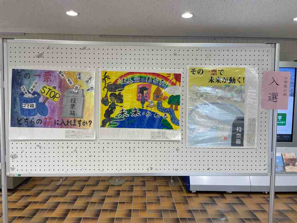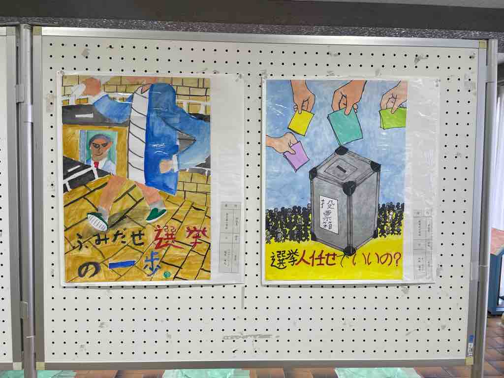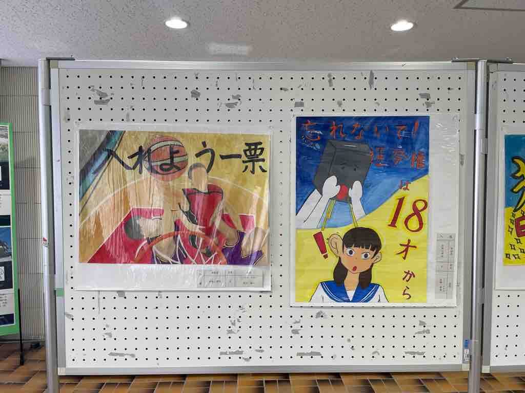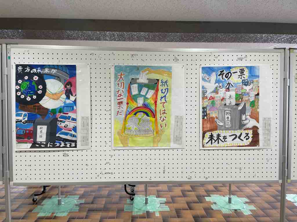 今、その場所を使って「明るい選挙啓発ポスター展示会」が開催されています。戸田市内の小中学生の作品が展示されておりますが、一つひとつ、つい見入ってしまうくらいの力作です。