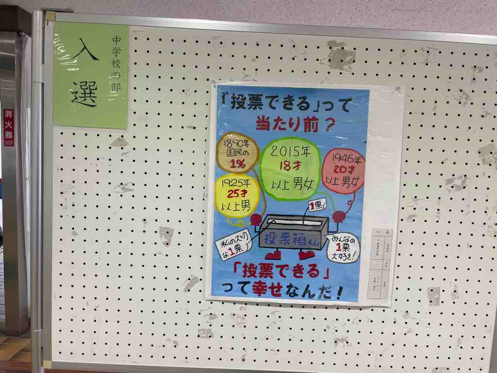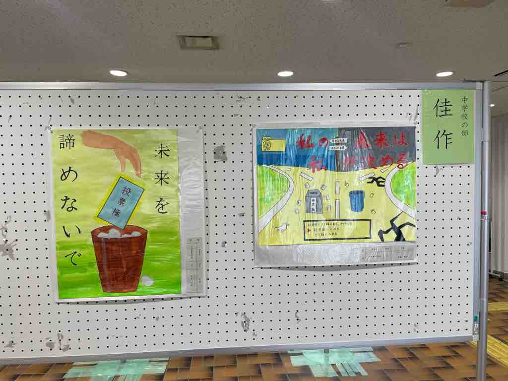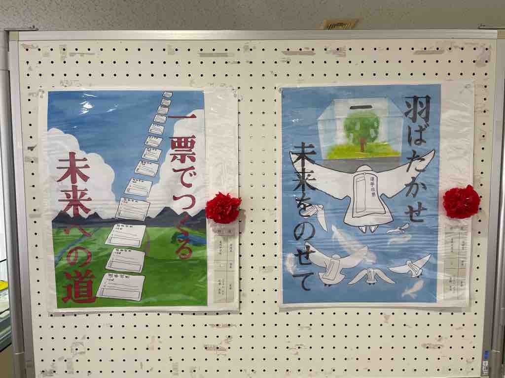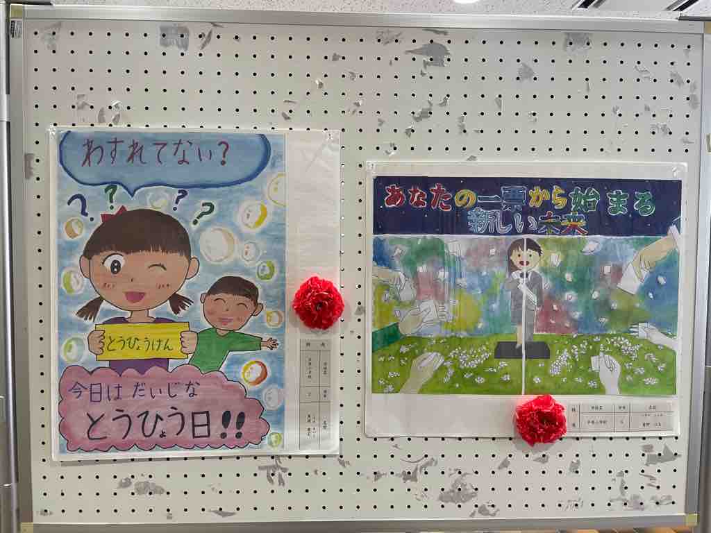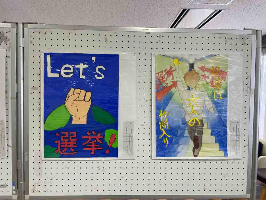今、その場所を使って「明るい選挙啓発ポスター展示会」が開催されています。戸田市内の小中学生の作品が展示されておりますが、一つひとつ、つい見入ってしまうくらいの力作です。