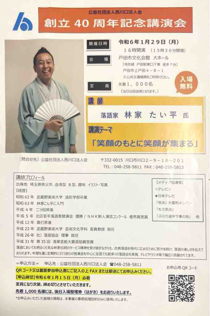 ◼︎林家たい平師匠講演会「笑顔のもとに笑顔が集まる」1月29日(月)戸田市文化会館で開催。入場無料。定員は申込先着1000名。(公社)西川口法人会創立40周年記念イベントです。