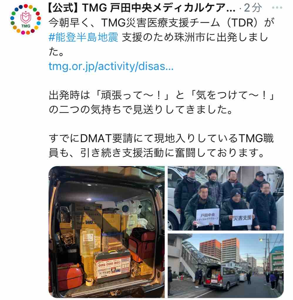 2024年01月16日 戸田中央メディカルケアグループ(TMG)さんの災害医療支援チームが能登半島地震被災地である珠洲市に出発されました。ありがとうございます。 戸田中央メディカルケアグループ(TMG)さんの災害医療支援チームが能登半島地震被災地である珠洲市に出発されました。ありがとうございます。https://x.com/tmg_sdgs/status/1747047764209393843?s=46&t=ZxIsJv1hBYS3w2uGmt14Vg#TMG #戸田中央メディカルケアグループ#能登半島地震 #DMAT 「戸田中央総合病院」カテゴリの最新記事 < 前の記事次の記事 > コメント コメントフォーム 名前 コメント 評価する リセット リセット 顔 星 投稿する 情報を記憶