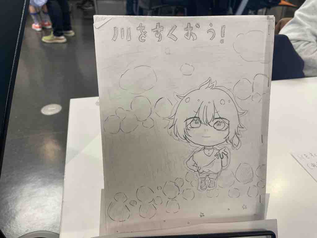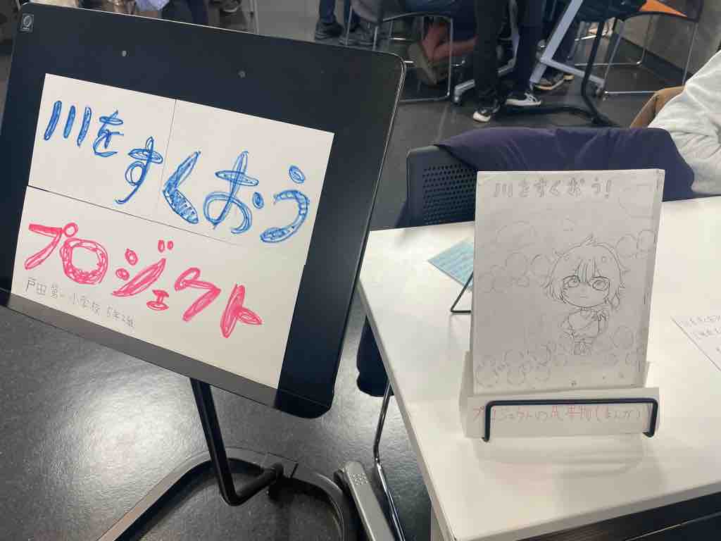 その中でもぜひ観ていただきたいのが「川をすくおう!」という取組を発表するブースにあるこの漫画。チームの成果物の一つですが、児童の作品とは思えないくらい素晴らしい内容です。このブースは目立たない場所にあるのですが、ぜひ児童たちから話を聴いてこの漫画を観てください!