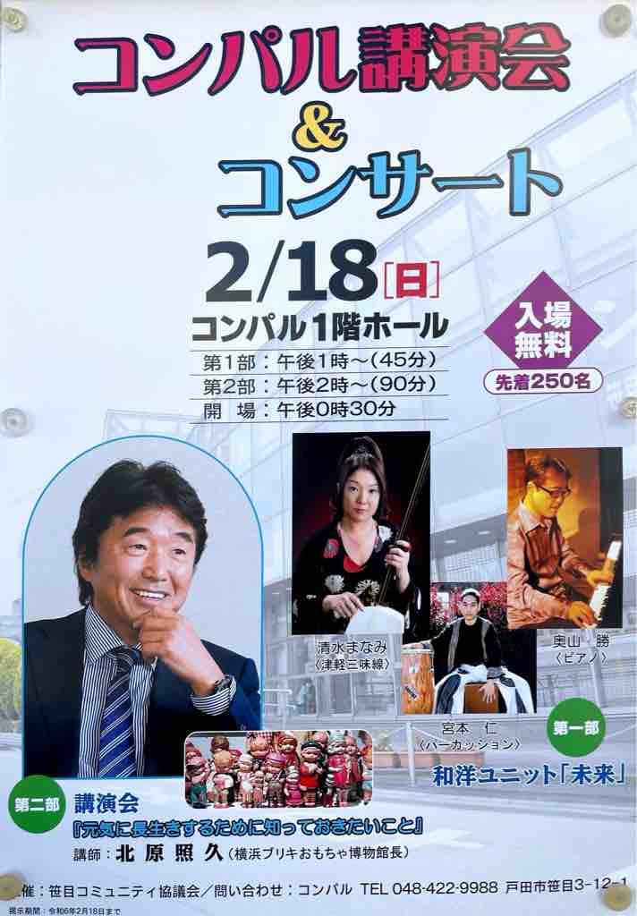 ■戸田市笹目コンパルで「コンパル講演会&コンサート」明後日2月18日(日)開催。清水まなみさんの津軽三味線出演、横浜ブリキおもちゃ博物館長の北原照久さんの講演会も魅力です!
