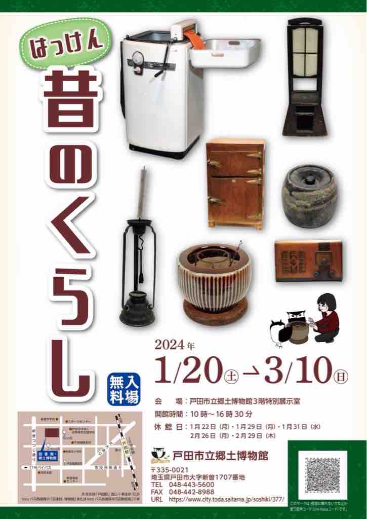 「はっけん 昔のくらし」は、小学3年生の「人々のくらしのうつりかわり」の学習に合わせて行われる展示です。本展示では、昭和時代を中心に、現在ではあまり見かけなくなった暮らしにまつわる道具やその移り変わり、戸田の町並みの移り変わりについて紹介します。また、今回は展示室内の土間の空間を新しくし、ロビーには懐かしい昔のおもちゃを紹介します。ぜひお越しください。