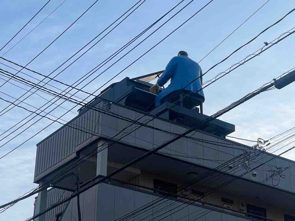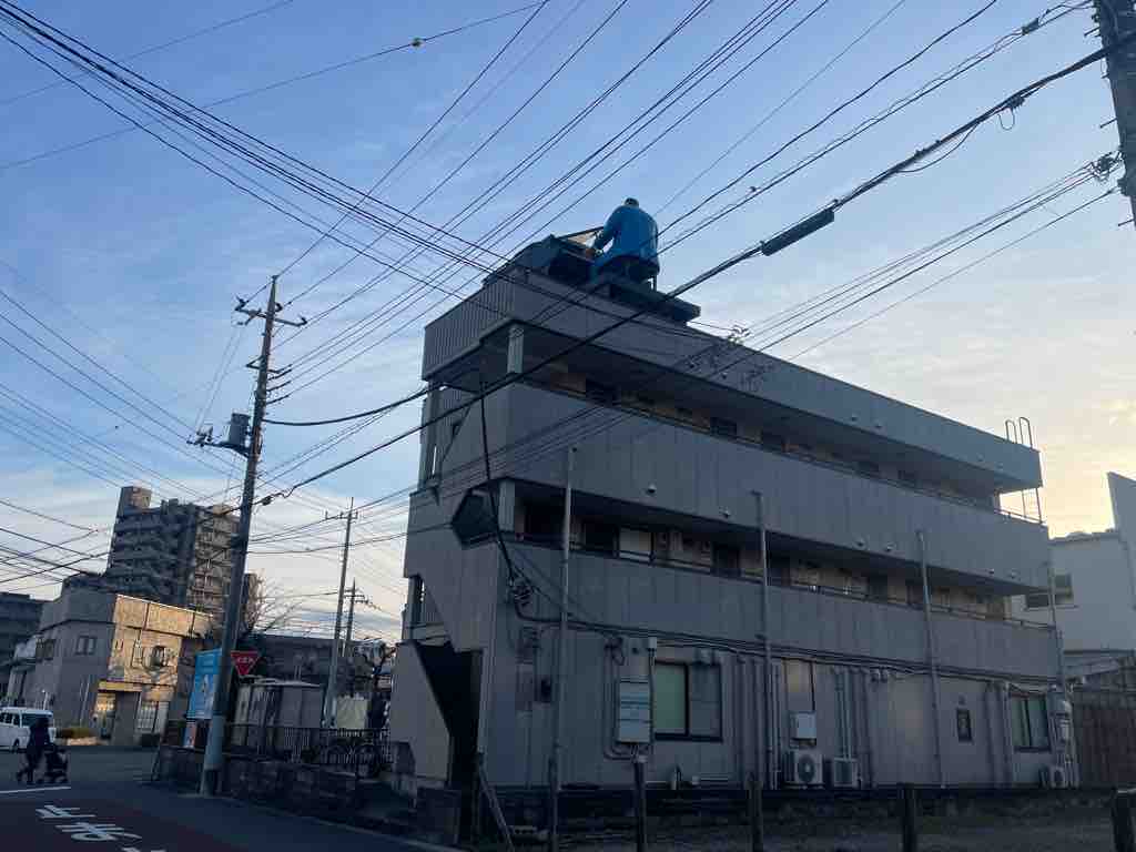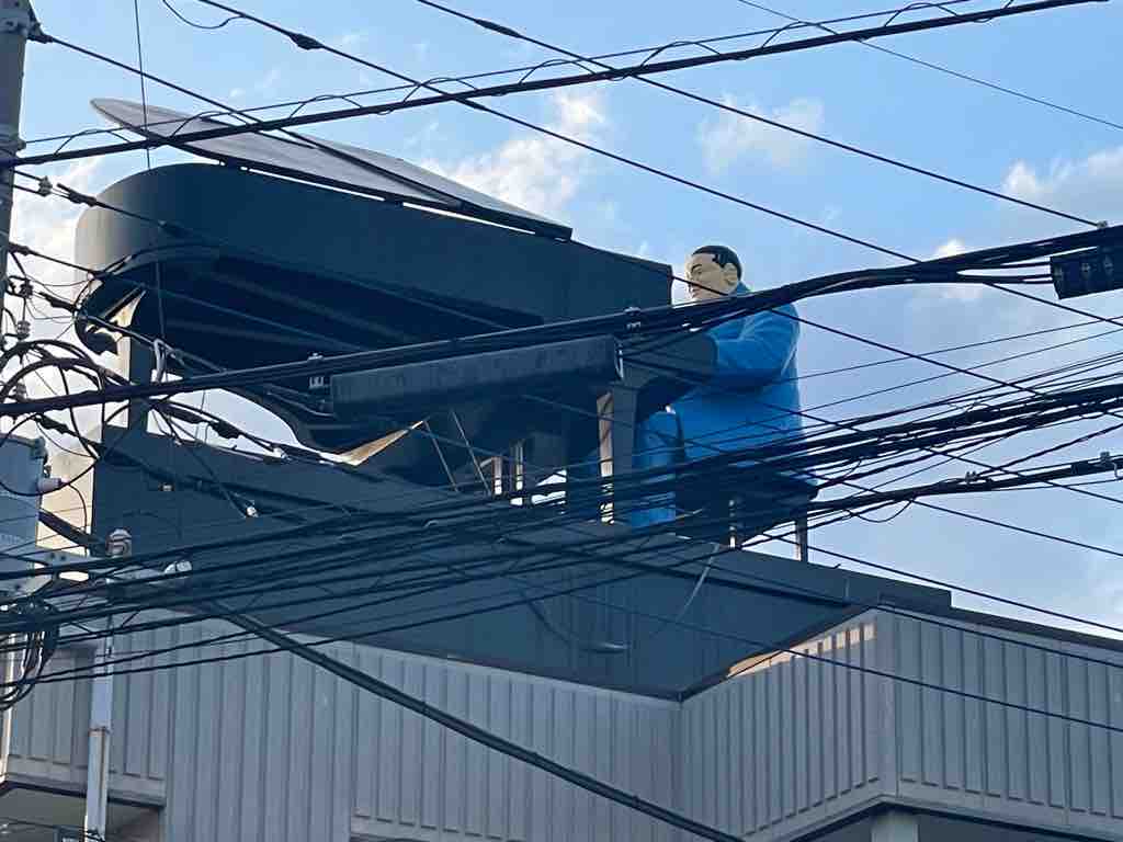 戸田市の新曽沖内交差点のすぐ近く、ビルの上で巨大なピアノを弾く巨人の姿があります。
