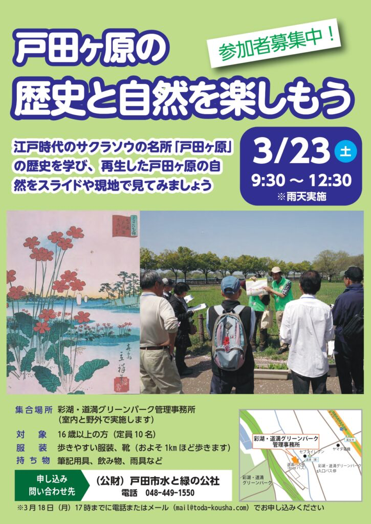 ■彩湖・道満グリーンパークで学ぶ「戸田ヶ原の歴史と自然を楽しもう」イベント、3月23日(土)開催。定員10名。参加者募集中。申込み締切は3月18日(月)です。