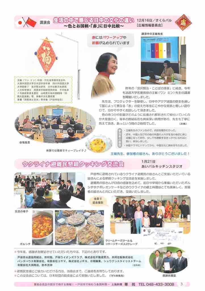 その他、これまでに行われた韓国料理のワールドクッキング、盆栽教室、中学生がスタッフ体験したチャレンジdays、そして12月に開催された王敏先生による講演会「生活の中で感じる日中の文化の違い」、ウクライナ避難民懇親クッキング交流会、青少年海外派遣事業などについて報告しています。