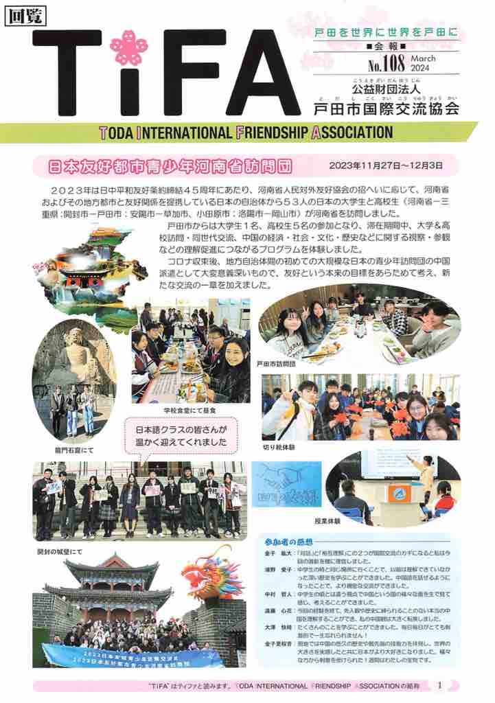 ■(公財)戸田市国際交流協会の会報誌「TiFA2024年3月号」が発行されています。第一面は「日本友好都市青少年河南省訪問団」報告。今回の編集後記は私(雪だるま)が担当しています。