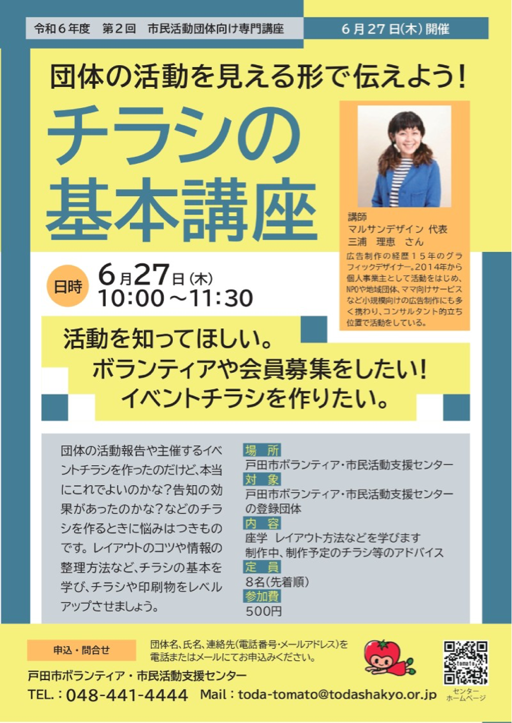 詳しくは添付画像のチラシ、もしくら戸田市ボランティア・市民活動支援センター(TOMATO)ホームページをご覧ください。