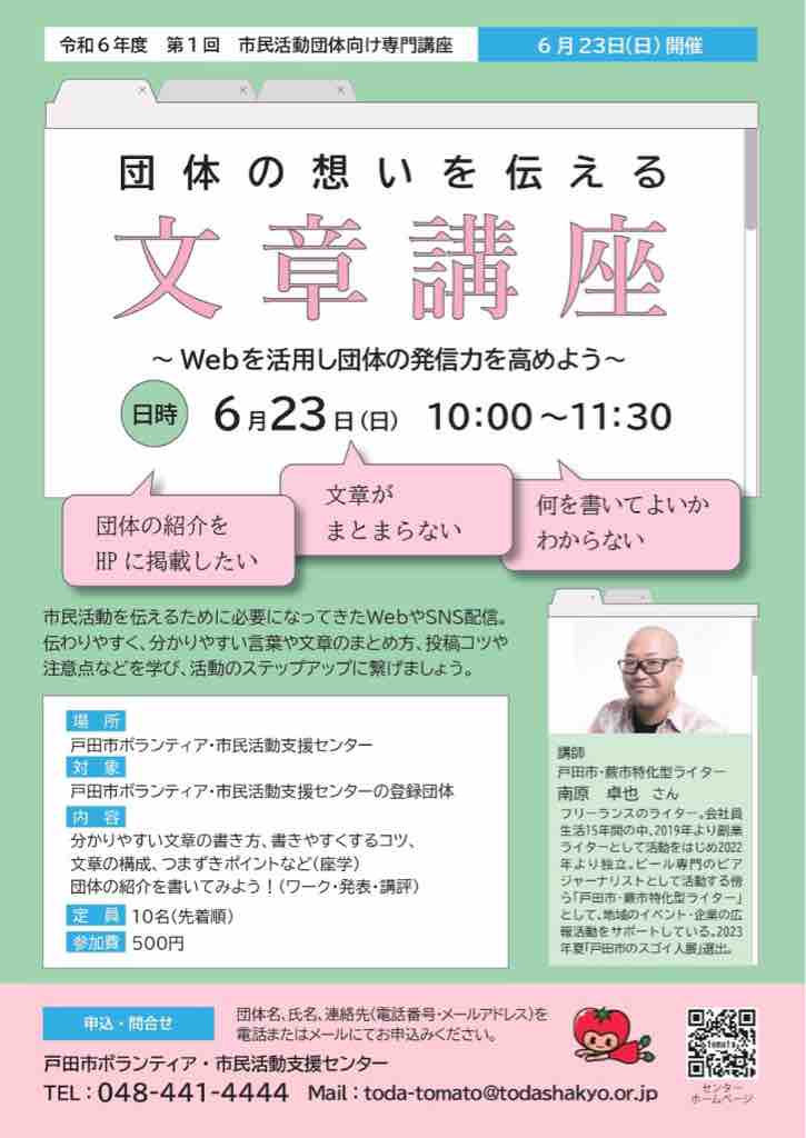 戸田市ボランティア・市民活動支援センター(TOMATO)に登録されている団体さん対象なのですが、この度、団体の想いを伝える「文章講座」と団体の活動を見える形で伝えよう「チラシの基本講座」が開催されることになりました。