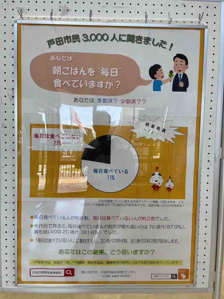 ■6月は「食育月間」。戸田市役所2階ロビーではパネル啓発展示中。「朝ごはんを毎日は食べていない」戸田市民の割合は5年前に比べて増えています。まずは「朝ごはん」を食べましょう!
