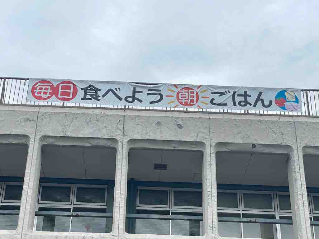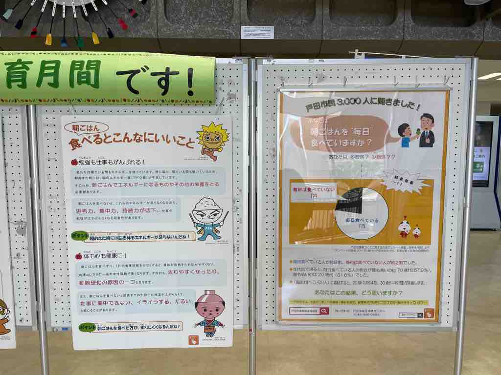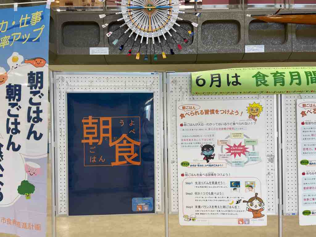 6月は食育月間ということで、戸田市役所2階ではパネル展示が行われており、また、市役所の東棟屋上には「毎日食べよう朝ごはん」という標語幕が設置されています。