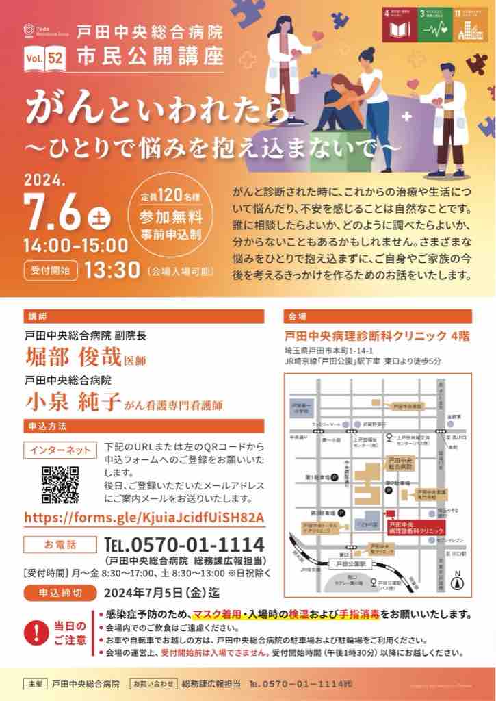■「がんといわれたら〜ひとりで悩みを抱え込まないで〜」戸田中央総合病院市民公開講座が7月6日14時より開催されます。定員先着120名。参加無料。申込は始まっています!ぜひ!